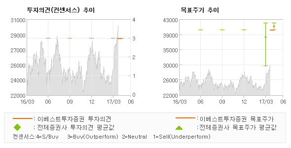 | 의견제시일자 | 증권사 | 투자의견 | 목표가 | | 20170418 | 이베스트투자증권 | 매수(신규) | 40,000 | | 20170411 | 유안타증권 | 매수(유지) | 42,000 | | 20170410 | 신한금융투자 | 매수(신규) | 41,000 | | 20170324 | KB증권 | 매수(유지) | 30,000 |