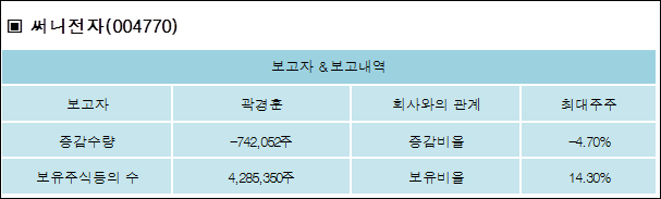 써니전자(004770)는 18일 최대주주 곽경훈을 비롯한 특별관계자의 보유주식이 감소되었다고 발표했다. 이는 직전 보고일보다 742,052주 감소하여 지분율은 14.3%로 하락했다. 이번 보고 사유는 지분장내매각에의한최대주주및특별관계자의보유주식수량변동으로 알려졌다.