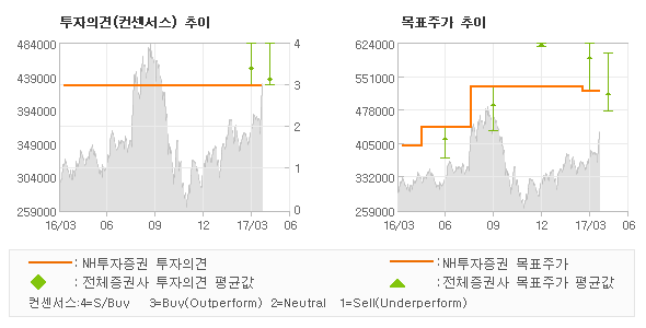 | 의견제시일자 | 증권사 | 투자의견 | 목표가 | | 20170418 | NH투자증권 | 매수(유지) | 520,000 | | 20170418 | 토러스투자증권 | STRONG BUY | 600,000 | | 20170418 | 유화증권 | 매수 | 480,000 | | 20170418 | KB증권 | 매수 | 510,000 |
