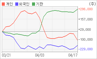 | 외국인과 개인은 순매도, 기관은 순매수(한달누적) 4월14일부터 전일까지 외국인이 2거래일 연속 순매수를 보였다. 4주간을 기준으로 보면 기관이 방향성있는 매매를 하면서 285,010주를 순매수한 반면, 외국인은 매도 후 매수의 관점을 보이고 있음에도 불구하고 176,667주를 순매도했고, 개인들도 매도 우위로 반전되면서 108,343주를 순매도했다. |