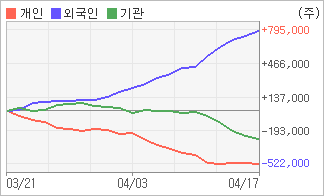 | 기관과 개인은 순매도, 외국인은 순매수(한달누적) 기관이 5일연속 주식을 팔고 있는 반면 외국인은 23일연속 주식을 사고 있다. 4주간을 기준으로 보면 외국인이 초반에 동종목을 순매수한 이후에 기세를 이어가며 794,155주를 순매수한 반면, 기관은 순매수에서 순매도로 반전되면서 272,573주를 순매도했고, 개인들도 매도쪽으로 방향을 잡으면서 521,582주를 순매도한 것으로 집계됐다. |