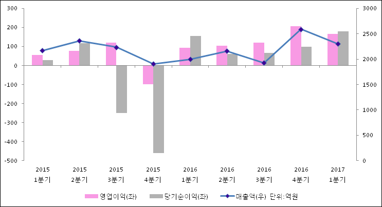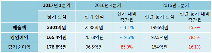 04월 18일 포스코ICT(022100)의 2017년 1분기 연결 잠정 실적이 발표됐다. 작년 같은 기간 대비해서 매출액, 영업이익, 당기순이익 모두 증가하였다. 1996억원이었던 매출액은 15.3% 증가하여 2301억원을 기록했다. 영업이익은 78.8% 상승하여 165.4억원이고, 당기순이익은 178.8억원으로 발표됐다.