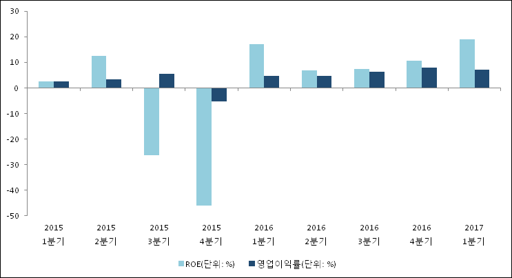 이번분기 기준으로 추정되는 포스코ICT의 자기자본이익률(ROE)은 19.1%로 나타났다. ROE는 최근 3분기 이상 꾸준히 상승해왔다. 전년 동기인 2016년 1분기 ROE는 17.2%로 이번 분기에 1.9%p 상승했다. 한편 동종목의영업이익률은 7.2%이다. 최근 4분기 이상 꾸준히 상승하다가 이번 분기에 하락했다. 지난해 동기 영업이익률은 4.6%로 이번 1분기가 2.6%p 상승했다.