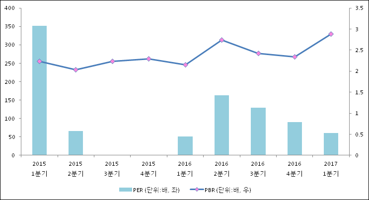 주가가 1주당 수익의 몇배가 되는지 나타내는 주가수익비율(PER)은 60.34배로 나타났다. PER은 최근 3분기 이상 연속으로 하락하고 있다. 전년 동기 PER은 50.72배로 이번 분기에 상승했다.주가가 1주당 순자산의 몇배인지 알려주는 주가순자산비율인 PBR은 2.88배이다. 지난해 동기 PBR은 2.15배로 이번 1분기 PBR이 상승했다.