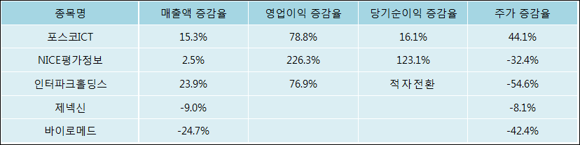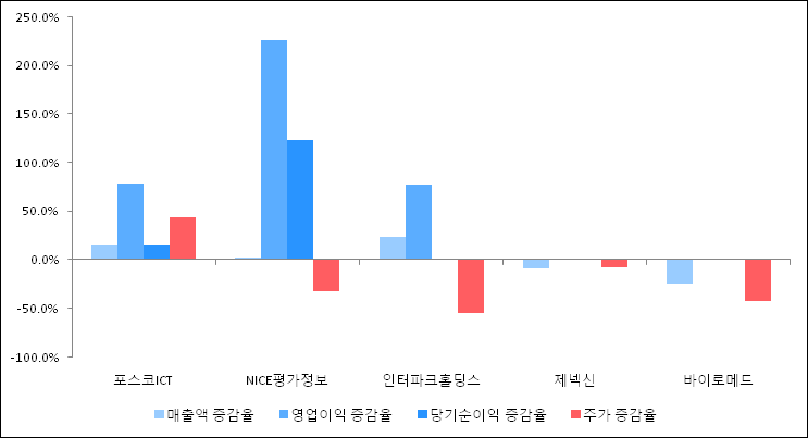 다음은 포스코ICT와 동일 업종 내 비교 그룹 종목의 각각 최근 실적의 전년 동기 대비 성장률이다. 포스코ICT의 매출액 증감율은 타 종목 대비 우수한 편이다. 그리고 주가는 가장 높은 상승률을 보였다.