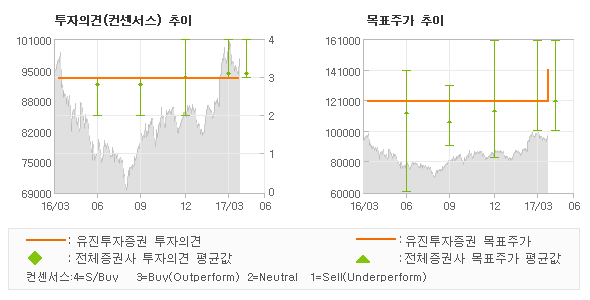 | 의견제시일자 | 증권사 | 투자의견 | 목표가 | | 20170419 | 유진투자증권 | 매수(유지) | 141,000 | | 20170419 | 메리츠종금증권 | 매수 | 130,000 | | 20170419 | 미래에셋대우 | 매수(유지) | 110,000 | | 20170419 | 유안타증권 | STRONG BUY | 160,000 |