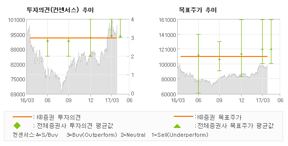 | 의견제시일자 | 증권사 | 투자의견 | 목표가 | | 20170419 | KTB투자증권 | 매수 | 130,000 | | 20170419 | 하나금융투자 | 매수 | 115,000 | | 20170419 | 유진투자증권 | 매수(유지) | 141,000 | | 20170419 | 메리츠종금증권 | 매수 | 130,000 |