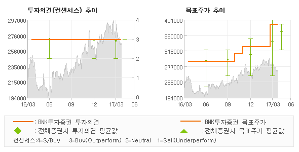 | 의견제시일자 | 증권사 | 투자의견 | 목표가 | | 20170419 | BNK투자증권 | 매수(유지) | 390,000 | | 20170419 | 이베스트투자증권 | 매수(유지) | 370,000 | | 20170419 | HMC투자증권 | 매수 | 380,000 | | 20170419 | 한국투자증권 | 매수(유지) | 365,000 |