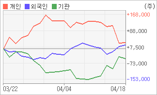| 외국인/개인 순매수, 기관은 순매도(한달누적) 4월14일부터 전일까지 외국인이 3거래일 연속 순매수를 보였다. 4주간을 기준으로 보면 외국인이 매매관점을 매도에서 매수로 전환하면서 19,420주를 순매수했고, 개인들도 매기를 떨어뜨리면서도 29,870주를 순매수했다. 하지만 기관은 매도 우위를 보이면서 49,290주를 순매도했다. |