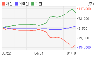 | 외국인/기관 순매수, 개인은 순매도(한달누적) 4월13일부터 전일까지 외국인이 4거래일 연속 순매수를 보였다. 4주간을 기준으로 보면 외국인이 매매관점을 매도에서 매수로 전환하면서 14,294주를 순매수했고, 기관도 방향성있는 매매를 하면서 116,238주를 순매수했다. 반면 개인들은 매도쪽으로 방향을 잡으면서 130,532주를 순매도한 것으로 나타났다. |