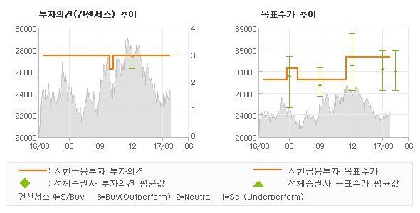 | 의견제시일자 | 증권사 | 투자의견 | 목표가 | | 20170419 | 신한금융투자 | 매수(유지) | 34,000 | | 20170419 | HMC투자증권 | 매수 | 33,000 | | 20170419 | 하나금융투자 | 매수 | 28,000 | | 20170419 | 삼성증권 | 매수 | 30,000 |
