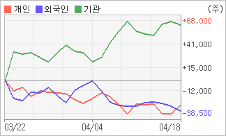 | 외국인과 개인은 순매도, 기관은 순매수(한달누적) 4월14일부터 전일까지 외국인이 3거래일 연속 순매도했다. 4주간을 기준으로 보면 기관이 방향성있는 매매를 하면서 63,880주를 순매수한 반면, 외국인은 매도 우위를 지속하면서 34,971주를 순매도했고, 개인들도 매도쪽으로 방향을 잡으면서 28,909주를 순매도했다. |