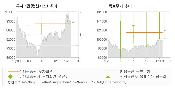 | 의견제시일자 | 증권사 | 투자의견 | 목표가 | | 20170419 | 키움증권 | 매수(유지) | 115,000 | | 20170419 | 동부증권 | 매수(유지) | 115,000 | | 20170419 | 케이프투자증권 | 매수(유지) | 120,000 | | 20170419 | 교보증권 | 매수(유지) | 128,000 |