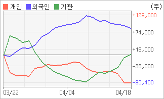 기관이 4일연속 순매수를 보이고 있는 반면에 외국인은 4일연속 순매도를 보이고 있다. 4주간을 기준으로 보면 외국인이 매수 우위를 유지하면서 87,712주를 순매수했고, 기관도 순매도를 기록하다가 다시 순매수로 돌아서면서 2,687주를 순매수했다. 반면 개인들은 매도쪽으로 방향을 잡으면서 90,399주를 순매도한 것으로 나타났다.