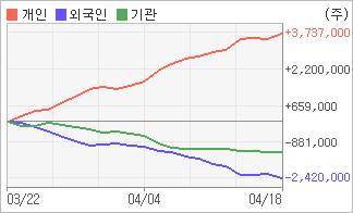 | 외국인과 기관은 순매도, 개인은 순매수(한달누적) 4월13일부터 전일까지 기관이 4거래일 연속 순매도를 보였다. 4주간을 기준으로 보면 외국인이 매도 우위를 지속하면서 2,419,634주를 순매도했고, 기관도 매도 관점으로 접근하면서 1,316,566주를 순매도했지만, 개인은 오히려 순매수량을 늘리며 3,736,200주를 순매수했다. |