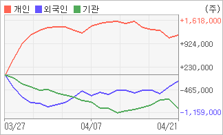 | 외국인과 기관은 순매도, 개인은 순매수(한달누적) 4월20일부터 전일까지 외국인이 2거래일 연속 순매수를 보였다. 4주간을 기준으로 보면 외국인이 매도 후 매수의 관점을 보이고 있음에도 불구하고 193,918주를 순매도했고, 기관도 매도 우위를 보이면서 1,001,079주를 순매도했지만, 개인은 오히려 매기를 떨어뜨리면서도 1,194,997주를 순매수했다. |