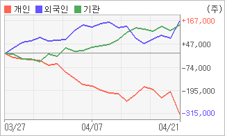 | 외국인/기관 순매수, 개인은 순매도(한달누적) 전일 외국인과 기관이 각각 88,155주, 26,839주를 순매수 했다. 4주간을 기준으로 보면 외국인이 초반에 동종목을 순매수한 이후에 기세를 이어가며 166,988주를 순매수했고, 기관도 방향성있는 매매를 하면서 147,042주를 순매수했다. 반면 개인들은 매도쪽으로 방향을 잡으면서 314,030주를 순매도한 것으로 나타났다. |