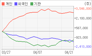 | 외국인과 기관은 순매도, 개인은 순매수(한달누적) 전일 기관이 349,443주를 순매수했고, 외국인은 269,921주를 순매도했다. 4주간을 기준으로 보면 외국인이 매도 우위를 지속하면서 1,605,450주를 순매도했고, 기관도 매도 우위를 보이면서 1,327,906주를 순매도했지만, 개인은 오히려 매기를 떨어뜨리면서도 2,933,356주를 순매수했다. |