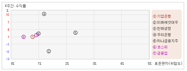 | 위험대비수익률 0.1로 하위권, 업종지수보다 낮아 24일 오후 2시50분 현재 전일대비 1.21% 오른 12,500원을 기록하고 있는 기업은행은 1개월전 대비 비슷한 주가수준을 보이고 있다. 동기간 동안에 주가움직임의 위험지표인 표준편차는 0.7%를 기록했다. 이는 금융업 업종내에서 주요종목들과 비교해볼 때 기업은행의 월간 변동성이 가장 작았던 만큼 주가등락률도 주요종목군 내에서 상대적으로 낮았다는 것을 의미한다. 최근 1개월을 기준으로 기업은행의 위험을 고려한 수익률은 0.1을 기록했는데, 변동성은 가장 낮았지만 주가가 상승하지 못했기 때문에 위험대비 수익률은 저조한 수준을 보여줬다. 게다가 금융업업종의 위험대비수익률인 1.0보다도 낮기 때문에 업종대비 성과도 긍정적이라고 할 수 없다. 다음으로 업종과 시장을 비교해보면 기업은행이 속해 있는 금융업업종은 코스피지수보다 변동성과 수익률이 모두 높은 모습이다. 다시 말하면 동업종에 탄력이 붙으면서 지수대비 초과상승했다는 의미이다. |