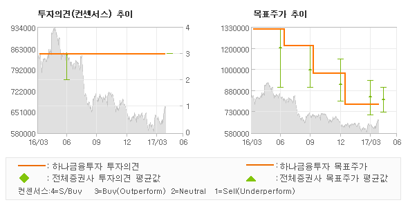 하나금융투자의 동종목에 대한 최근 1년동안의 투자의견은 전체적으로 큰 변화없이 유지되고 있다. 목표주가는 2016년4월 1,320,000원까지 높아졌다가 2017년1월 780,000원을 최저점으로 목표가가 제시된 이후 최근에도 780,000원으로 제시되고 있다. |