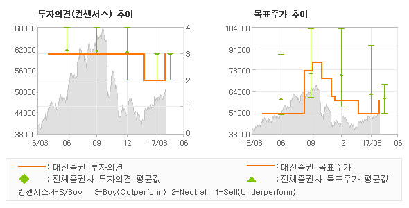 | 의견제시일자 | 투자의견 | 목표가격 | | 20170424 | 매수(상향) | 58,000 | | 20170404 | MARKETPERFORM | 50,000 | | 20170220 | 시장수익률(하향) | 50,000 | | 20170207 | 매수 | 58,000 |