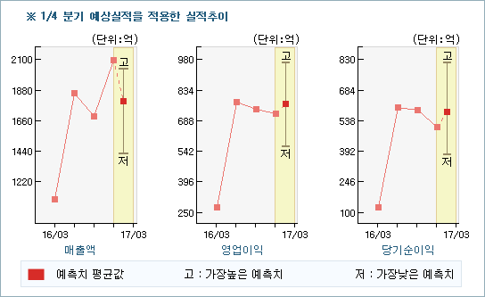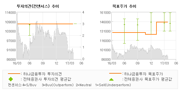 | 의견제시일자 | 증권사 | 투자의견 | 목표가 | | 20170424 | 하나금융투자 | 매수 | 145,000 | | 20170419 | 동부증권 | 매수(유지) | 135,000 | | 20170419 | 이베스트투자증권 | 매수(유지) | 160,000 | | 20170411 | 신영증권 | 매수 | 130,000 |