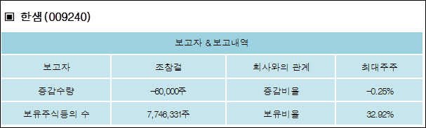 한샘(009240)은 25일 최대주주 조창걸을 비롯한 특별관계자의 보유주식이 감소되었다고 발표했다. 이는 직전 보고일보다 60,000주 감소하여 지분율은 32.92%로 하락했다. 이번 보고 사유는 시간외장내매도,증여로 알려졌다.