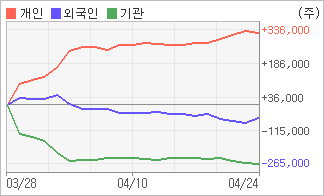 | 외국인과 기관은 순매도, 개인은 순매수(한달누적) 4월20일부터 전일까지 기관이 3거래일 연속 순매도를 보였다. 4주간을 기준으로 보면 외국인이 매도 우위를 지속하면서 58,364주를 순매도했고, 기관도 매도 관점으로 접근하면서 264,329주를 순매도했지만, 개인은 오히려 순매수량을 늘리며 322,693주를 순매수했다. |