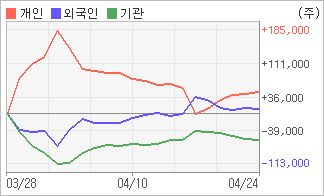 | 외국인/개인 순매수, 기관은 순매도(한달누적) 4월18일부터 전일까지 기관이 5거래일 연속 동종목을 내다 팔았다. 4주간을 기준으로 보면 외국인이 매매관점을 매도에서 매수로 전환하면서 9,987주를 순매수했고, 개인들도 매기를 떨어뜨리면서도 47,930주를 순매수했다. 하지만 기관은 매도 우위를 보이면서 57,917주를 순매도했다. |