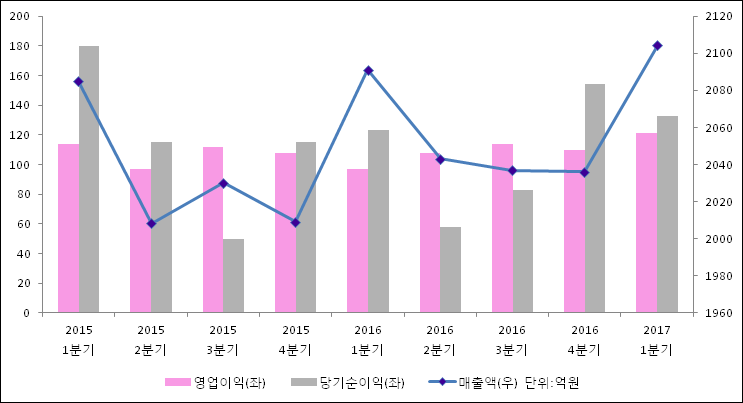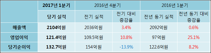 04월 25일 대교(019680)의 2017년 1분기 연결 잠정 실적이 발표됐다. 지난해 같은 기간 대비해서 매출액, 영업이익, 당기순이익 모두 증가하였다. 2092억원이었던 매출액은 0.6% 증가하여 2104억원을 기록했다. 영업이익은 25.1% 상승하여 121.4억원이고, 당기순이익은 132.7억원으로 발표됐다.