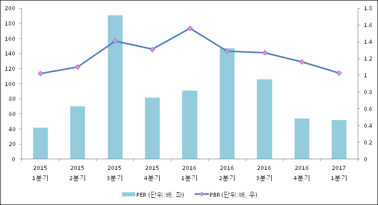 주가가 1주당 수익의 몇배가 되는지 나타내는 주가수익비율(PER)은 51.87배로 나타났다. PER은 최근 3분기 이상 연속으로 하락하고 있다. 전년 동기 PER은 91.03배로 이번 분기에 하락했다.주가가 1주당 순자산의 몇배인지 알려주는 주가순자산비율인 PBR은 1.03배이다. PBR은 최근 4분기 이상 연속으로 하락하고 있다. 지난해 동기 PBR은 1.56배로 이번 1분기 PBR이 하락했다.
