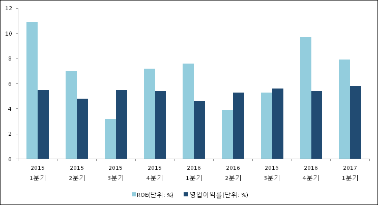 이번분기 기준으로 추정되는 대교의 자기자본이익률(ROE)은 7.9%로 나타났다. 전년 동기인 2016년 1분기 ROE는 7.6%이다. 한편 동종목의영업이익률은 5.8%이다. 이는 최근 1년동안 큰 변동없이 비슷한 수치이다. 지난해 동기 영업이익률은 4.6%로 이번 1분기가 1.2%p 상승했다.