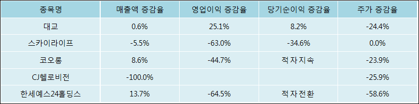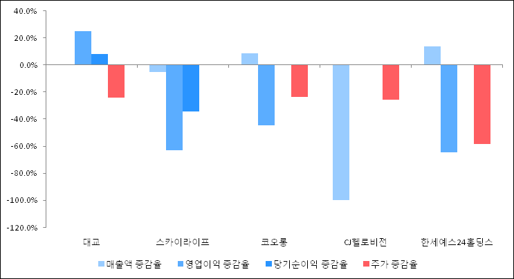 다음은 대교와 동일 업종 내 비교 그룹 종목의 각각 최근 실적의 전년 동기 대비 성장률이다. 대교의 매출액 증감율은 타 종목 대비 양호한 편이다. 그리고 주가는 하락하였지만 하락율이 비교적 크지는 않았다.