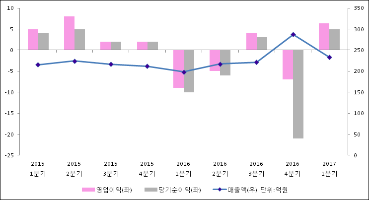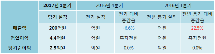 04월 25일 TPC(048770)의 2017년 1분기 연결 잠정 실적이 발표됐다. 매출액은 지난해 같은 기간 대비해서 17.7% 증가하여 233억원을 달성했다. 영업이익은 -9.4억원에서 6.4억원으로 흑자전환되었다. 당기순이익은 5억원으로 -9.8억원에서 흑자전환되었다.