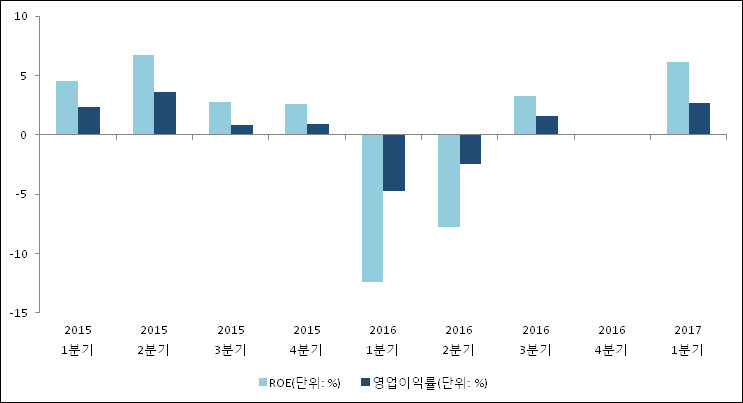 이번분기 기준으로 추정되는 TPC의 자기자본이익률(ROE)은 6.1%로 나타났다. 전년 동기인 2016년 1분기 ROE는 -12.4%로 이번 분기에 18.5%p 상승했다. 한편 동종목의영업이익률은 2.7%이다. 지난해 동기 영업이익률은 -4.7%로 이번 1분기가 7.4%p 상승했다.