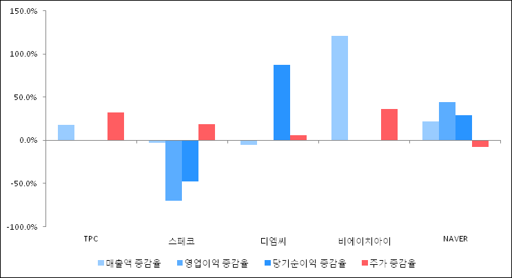 다음은 TPC와 동일 업종 내 비교 그룹 종목의 각각 최근 실적의 전년 동기 대비 성장률이다. TPC의 매출액 증감율은 타 종목 대비 양호한 편이다. 그리고 주가 상승률은 높은 편이다.