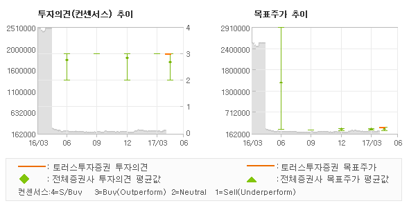 | 의견제시일자 | 증권사 | 투자의견 | 목표가 | | 20170425 | 토러스투자증권 | 매수(신규) | 290,000 | | 20170411 | NH투자증권 | HOLD(유지) | 213,000 | | 20170403 | 신영증권 | 매수(유지) | 240,000 | | 20170313 | 신한금융투자 | 매수 | 230,000 |