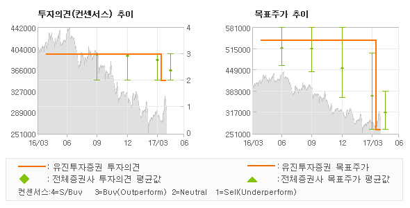 | 의견제시일자 | 증권사 | 투자의견 | 목표가 | | 20170425 | 유진투자증권 | HOLD(유지) | 260,000 | | 20170425 | 바로투자증권 | HOLD(유지) | 300,000 | | 20170425 | 신한금융투자 | TRADING BUY(하향) | 310,000 | | 20170425 | 이베스트투자증권 | HOLD(하향) | 320,000 |