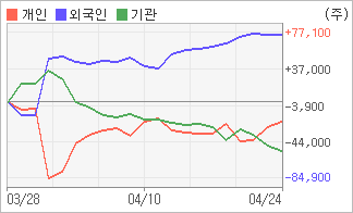 | 기관과 개인은 순매도, 외국인은 순매수(한달누적) 4월20일부터 전일까지 기관이 3거래일 연속 순매도를 보였다. 4주간을 기준으로 보면 외국인이 초반에 동종목을 순매수한 이후에 기세를 이어가며 75,263주를 순매수한 반면, 기관은 매도 관점으로 접근하면서 54,334주를 순매도했고, 개인들도 매도쪽으로 방향을 잡으면서 20,929주를 순매도한 것으로 집계됐다. |