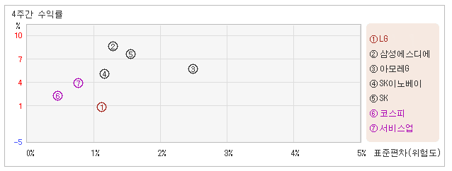 | 관련종목들 가운데 변동폭 커도 수익율은 낮아 25일 오후 1시50분 현재 전일대비 1.15% 하락하면서 69,000원을 기록하고 있는 LG는 지난 1개월간 0.29% 하락했다. 같은 기간동안 변동성의 크기를 말해주는 표준편차는 1.1%를 기록했다. 이는 코스피 업종내에서 주요종목들과 비교해볼 때 LG의 월간 변동성은 작았지만, 주가가 마이너스를 기록하면서 주가등락률도 주요종목군 내에서 가장 낮은 수준을 유지했다는 것이다. 최근 1개월을 기준으로 LG의 위험을 고려한 수익률은 -0.2를 기록했는데, 변동성은 상대적으로 낮지만 주가가 약세를 보였기 때문에 위험대비 수익률은 가장 저조한 모습을 나타냈다. 게다가 코스피업종의 위험대비수익률 3.7보다도 낮기 때문에 업종대비 성과도 좋지 않았다고 할 수 있다. 다음으로 업종과 시장을 비교해보면 LG가 속해 있는 코스피업종은 서비스업지수보다 변동성과 수익률이 모두 낮은 모습을 보여주고 있다. 다시 말해서 동업종의 탄력이 떨어지면서 업종상승률도 미진했다는 의미이다. |