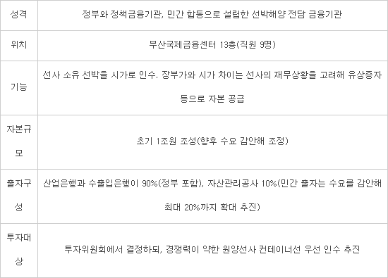한국선박해양 설립은 정부가 지난해 10월 발표한 '해운·조선산업 경쟁력 강화 방안'의 핵심 사업이다. 한국산업은행이 50% 지분을 출자하고 한국수출입은행과 한국자산관리공사가 각각 40%, 10%를 출자해 설립했다.