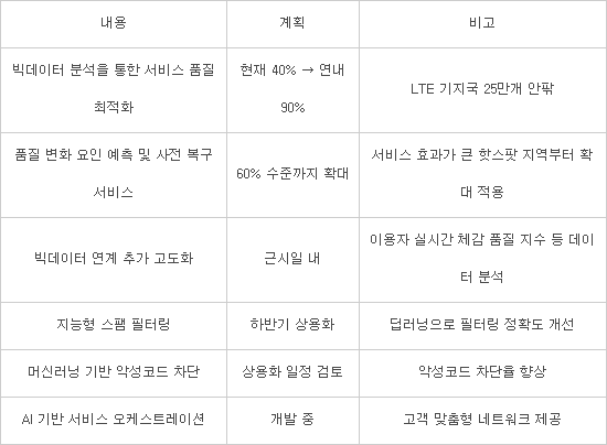 SK텔레콤은 트래픽 급증에 따른 품질 변화 요인을 예측, 스스로 해결하는 '품질 변화 요인 예측 및 사전 복구 서비스'도 현재 30% 수준에서 60%로 적용 범위를 늘린다. 관계자는 AI 네트워크 확산으로 2100여만명의 LTE 고객에 대한 속도 등 체감 품질이 이전과 확연하게 달라질 것이라고 자신했다.