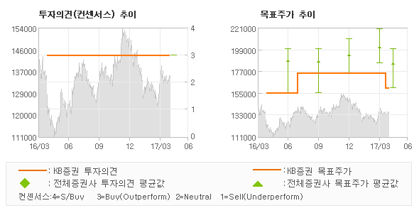 KB증권의 동종목에 대한 최근 1년동안의 투자의견은 전체적으로 큰 변화없이 유지되고 있다. 목표주가는 2016년4월 155,000원이 저점으로 제시된 이후 2016년7월 175,000원을 최고점으로 목표가가 제시되었고 최근에는 160,000원으로 다소 하향조정되고 있다. |