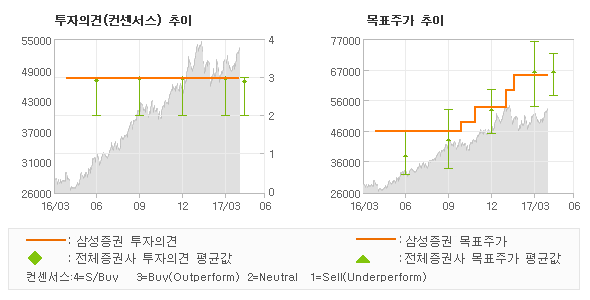 | 의견제시일자 | 증권사 | 투자의견 | 목표가 | | 20170426 | 삼성증권 | 매수 | 65,000 | | 20170426 | 유안타증권 | 매수(유지) | 71,000 | | 20170426 | 미래에셋대우 | TRADING BUY(유지) | 62,000 | | 20170426 | KB증권 | 매수(유지) | 66,000 |
