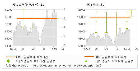 | 의견제시일자 | 증권사 | 투자의견 | 목표가 | | 20170426 | 하나금융투자 | 매수 | 125,000 | | 20170417 | 유안타증권 | 매수(신규) | 110,000 | | 20170412 | 흥국증권 | 매수(유지) | 120,000 | | 20170411 | BNK투자증권 | 매수(유지) | 120,000 |
