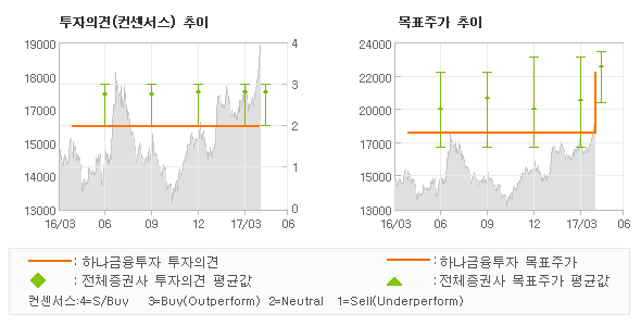 | 의견제시일자 | 증권사 | 투자의견 | 목표가 | | 20170426 | 하나금융투자 | NEUTRAL | 22,000 | | 20170426 | 삼성증권 | 매수 | 23,000 | | 20170426 | 미래에셋대우 | 매수(유지) | 23,400 | | 20170410 | 대신증권 | 매수(유지) | 20,000 |