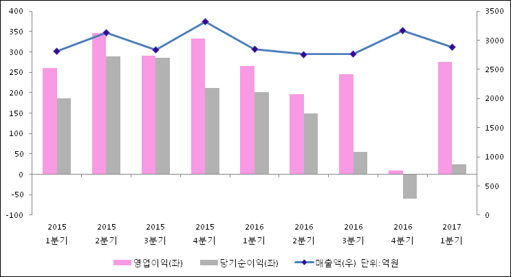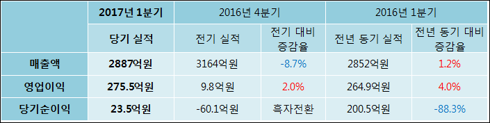 04월 26일 S&T모티브(064960)의 2017년 1분기 연결 잠정 실적이 발표됐다. 매출액 2887억원으로, 영업이익은 275.5억원으로 전년 같은 기간 대비 각각 1.2%, 4% 증가했다. 반면 당기순이익은 23.5억원으로 88.3% 하락했다.
