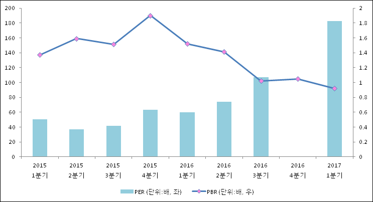주가가 1주당 수익의 몇배가 되는지 나타내는 주가수익비율(PER)은 182.5배로 나타났다. 전년 동기 PER은 59.57배로 이번 분기에 상승했다.주가가 1주당 순자산의 몇배인지 알려주는 주가순자산비율인 PBR은 0.92배이다. 지난해 동기 PBR은 1.52배로 이번 1분기 PBR이 하락했다.