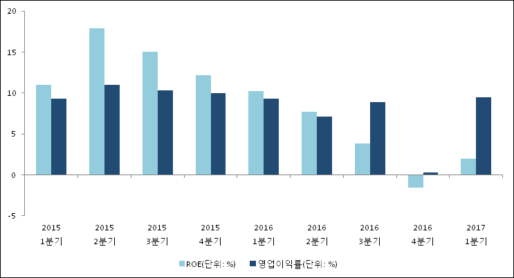 이번분기 기준으로 추정되는 S&T모티브의 자기자본이익률(ROE)은 2%로 나타났다. ROE는 최근 6분기 이상 연속으로 하락하다 이번 분기에 상승했다. 전년 동기인 2016년 1분기 ROE는 10.2%로 이번 분기에 8.2%p 하락했다. 한편 동종목의영업이익률은 9.5%이다. 지난해 동기 영업이익률은 9.3%로 이번 분기와 비슷한 수치이다.