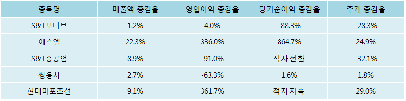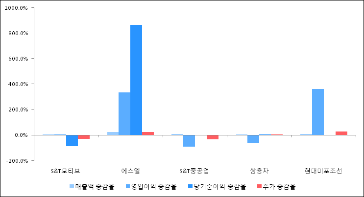 다음은 S&T모티브와 동일 업종 내 비교 그룹 종목의 각각 최근 실적의 전년 동기 대비 성장률이다. S&T모티브의 매출액은 증가했지만 증감율은 타 종목 대비 가장 저조한 편이다. 그리고 주가의 하락율이 비교적 큰 편으로 나타났다.